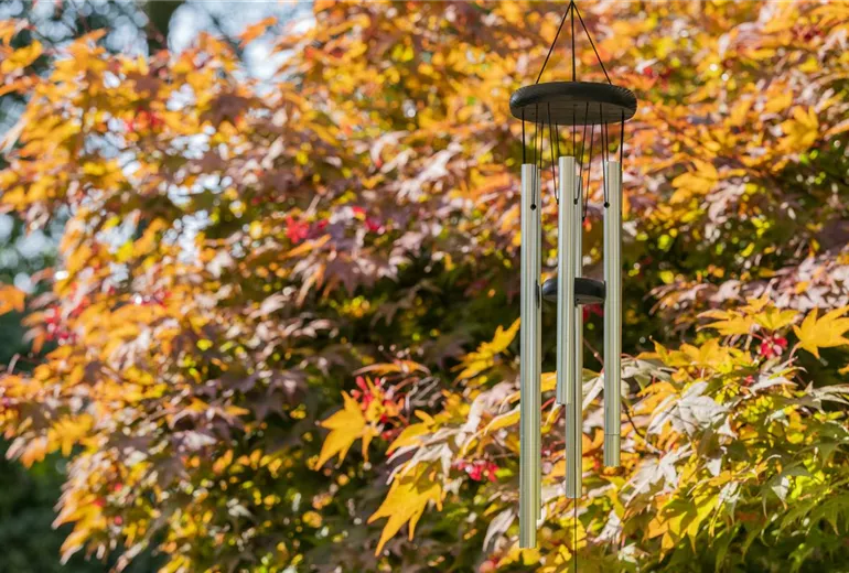 Hängende Metallschalen oder -scheiben, Holzstücke und Aluminiumrohre dienen als Xylophone und Glöckchen klimpern verspielt im Wind. Und selbst mit wetterfesten Instrumenten wie Blockflöten aus Kunststoff und ähnlichem können Sie Ihren Klanggarten erweitern.