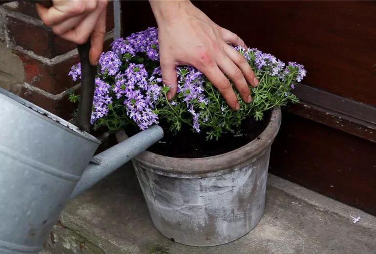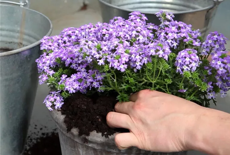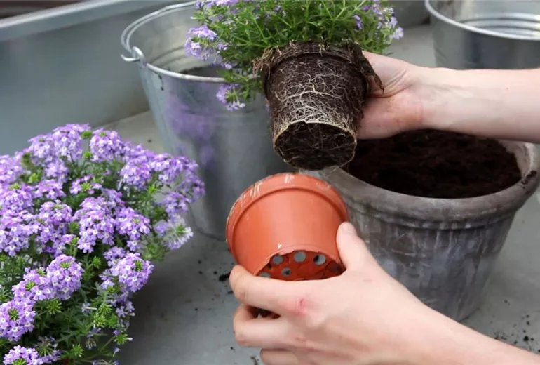 Um die Pflanze zu neuem Wurzelwachstum anzuregen, empfiehlt es sich, den Wurzelballen etwas aufzulockern; besonders wenn das Eisenkraut den alten Topf bereits stark durchwurzelt hat.