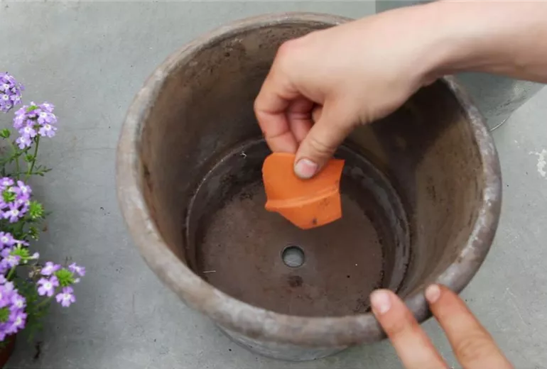 Bevor Sie frische Blumen- oder Balkonpflanzenerde aus dem Fachhandel in den Topf füllen, sollten Sie das Loch so abdecken, dass es nicht verstopfen kann.